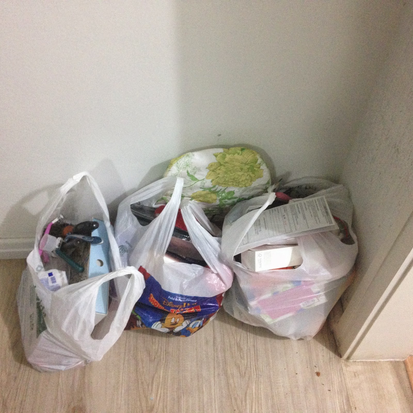 O conjunto da obra do destralhe do banheiro, três sacolas cheias de produtos vencidos: